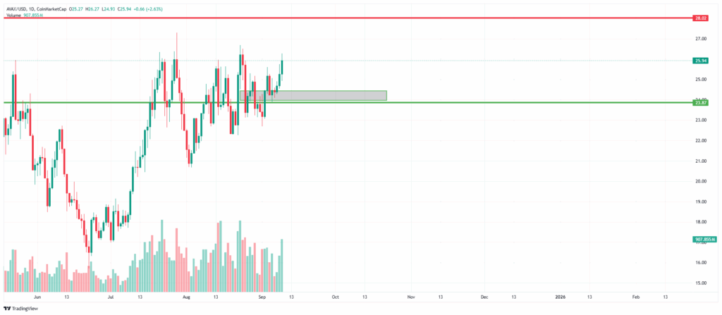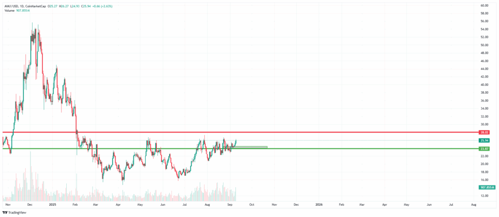 AVAX is consolidating but is showing signs of bullish momentum. If buyers push past the $27 to $28 resistance, a rally toward $30 to $36 seems possible. However, failure to break this zone could keep AVAX trading between $24 and $26. Do your own research.